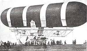 Built at the Army's Balloon Factory at Farnborough, the early design work was carried out by Colonel James Templer, and it was completed by Colonel John Capper of the Royal Engineers and Samuel Cody, who was mainly responsible for developing the steering gear and power installation.[1] It had a cylindrical envelope constructed from goldbeater's skin without internal ballonets,[2] from which a long triangular-section framework of steel tubing was suspended by four silk bands. The control surfaces, consisting of a rudder and elevators at the rear, a pair of large elevators amidships and a further pair at the front, were attached to this framework, and a small gondola containing the crew and power installation suspended beneath it. It was powered by a 50 hp (37 kW) Antoinette engine driving a pair of two-bladed aluminium propellers via leather belts.[3] The pitch of the propellers could be adjusted when the airship was on the ground.[4]