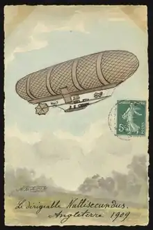 Nulli Secundus was first flown on 10 September 1907 at Farnborough, with Capper at the controls, assisted by Cody and Captain King. Two flights were made: during the first, the airship was flown for around three miles at a height of about 200 ft (60 m), the flight being terminated by an engine fault. A second flight was made later in the day, the propeller blades having been reduced in area in order to increase their speed of revolution.[5]
