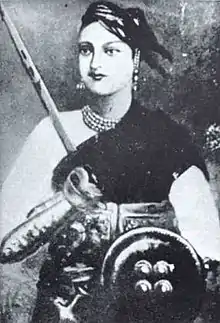 Lakshmibai, the Rani of Jhansi, one of the principal leaders of the Indian Rebellion of 1857, who earlier had lost her kingdom as a result of Lord Dalhousie's Doctrine of Lapse