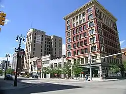 The area where the district is located was developed in the late 1800s as a commercial area catering to the women's trade, and included businesses such as hairdressers, florists, corset makers, and fashionable clothiers.[2] A number of these women's trade shops were owned by ethnic immigrants. During the 1910s, the area began transforming into a banking and financial center. In the adjoining Randolph Street Commercial Buildings Historic District, the building at 1244 Randolph St. is a rare survivor from the 1840s.[3] The Breitmeyer-Tobin Building on Broadway Avenue, now called Harmonie Centre, opened to African-American tenants in 1936. In the 1950s, ethnic and immigrant-owned shops moved into the area, with some of them still in the districts to the present day. The east necklace of downtown links Grand Circus and the stadium area to Greektown along Broadway. The east necklace contains a sub-district sometimes called the Harmonie Park District in the Broadway Avenue Historic District which has taken on the legacy of Detroit's music from the 1930s through the 1950s and into the present.[4]