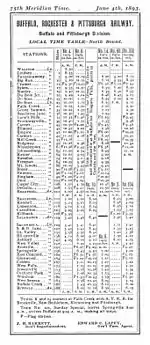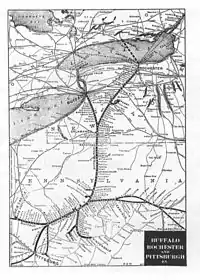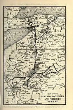 The Buffalo, Rochester and Pittsburgh Railway thrived on the haulage of heavy freight, primarily Pennsylvania coal, but its passenger service was characterized as "second to none".[23] The first passenger run took place on the Rochester and State Line Railroad on its 15 September 1874 run from Rochester to Le Roy. The last was on 15 October 1955, when the Baltimore and Ohio Railroad ended its Buffalo - Pittsburgh service.