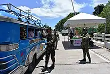 Due to the increase of cases in Cebu despite the ECQ, tougher measures were enacted. One June 22, President Duterte ordered Roy Cimatu, Secretary of the Department of Environment and Natural Resources, to lead and oversee the COVID-19 response.[48][49] Backed by soldiers of the Philippine Army, operatives from the Philippine National Police's Special Action Force, and armored vehicles, patrols were made in areas where there were numerous cases or reported quarantine violators such as Barangay Luz, Barangay Alaska Mambaling, Barangay Calamba, and Barangay San Nicholas.[50] IATF officials also conducted aerial surveys of Cebu City in conjunction with the Philippine Air Force.[51][52]