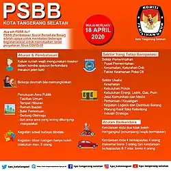 Instead of implementing a nationwide lockdown, the government had approved large-scale social restrictions (Indonesian: Pembatasan Sosial Berskala Besar, abbreviated as PSBB) for some regencies and cities. Starting from late May 2020, they began to apply new normal, along with another green and yellow zone regions. This policy received much criticism and is considered as a 'disaster' due to the still increasing number of cases.[10]