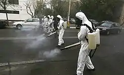 On 2 March, the government announced plans to mobilise 300,000 soldiers and volunteers to combat the spread of the virus, as well as to deploy drones and water cannons to disinfect streets.[156] On 13 March, a plan was announced to clear streets, shops, and public places by the Revolutionary Guards. In addition, 1,000 fixed and mobile detection clinics would be set up, the army would work alongside medical staff as well as producing face masks and gloves, and army beds would be made available for patients.[157]