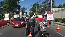 A total of 56 checkpoints were set up to man the borders of Metro Manila on the first day of the partial lockdown.[35] At 12 midnight, a total of 26,000 police and military personnel were deployed to contain the pandemic of COVID-19 in the region. Motorists were stopped randomly and asked for their identification along the borders in North Luzon Expressway, MacArthur Highway, and the National Road (Maharlika Highway). Some checkpoints lacked thermal scanners.[71]