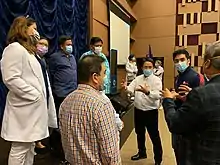 On April 1, the City of Manila reports its largest single-day increase in coronavirus infections so far with 41 new cases, bringing the city's total to 116.[46] In the same day, more than 800 Filipino repatriates from four virus-stricken cruise ships in the U.S. arrive at the Ninoy Aquino International Airport.[47] The Inter-Agency Task Force on Emerging Infectious Diseases (IATF-EID) announced on April 2 that Metro Manila remains the worst hit by the coronavirus crisis in the country after 1,511 cases were confirmed in the region, or more than 50 percent of the total confirmed cases in the Philippines by that time.[48] COVID-19 inter-agency taskforce spokesman Karlo Nograles announces the mandatory wearing of face masks in public for residents in all regions under enhanced community quarantine in Luzon.[49] The Department of Health launches a 24/7 coronavirus hotline for Metro Manila residents.[50] On April 6, a ten-man medical team from China arrive in Manila to share their experience in prevention and control of the coronavirus disease,[51] while the Metro Manila Development Authority installed decontamination tents in all public hospitals and government offices across the region.[52] On April 3, the National Capital Region Police Office confirm its first COVID-19 casualty among its ranks.[53]