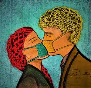 - In April, street artist Banksy published a new piece of his trademark wall art—this time located in his own bathroom, referencing the required self-isolation—with coronavirus as the theme and "stir-crazy rats" as its subject. He published photographs of it online.[40] In July he continued the rats theme, with several stencil graffiti of rats wearing and playing with facemasks in a London tube carriage.[41]