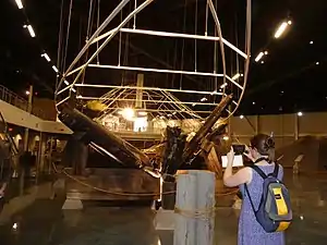 After nearly a century, the remaining lower hull of the ironclad was discovered and then raised in 1963; approximately 15,000 shipboard artifacts were recovered and carefully cataloged. Neuse's hull was then temporarily installed in the Governor Caswell Memorial, beside the river, in Kinston.[2][3] Since 2013, Neuse and her artifacts have been on display in a new, climate-controlled building in downtown Kinston.[4][5][6]