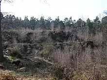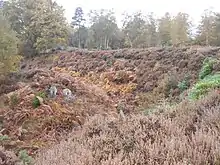 The layout consists of a number of steep banks and ditches in the shape of an oak leaf, enclosing a large flat area of a settlement. The main entrance is at its northern end (at the tip of the leaf) and is very well defended with multiple banks and a sinuous entrance road. The banks to the side of the entrance are very steep, guiding any entrants along the way.[3] It is north of the Roman road known as the Devil's Highway which connected Londinium to Calleva Atrebatum (Silchester). It is within the Crowthorne Woods part of Swinley Forest crown plantation and is located off Nine Mile Ride approximately 0.75 miles (1.2 km) from the Look Out visitor centre. Much of the fort is covered by mature broadleaf and coniferous trees, although some of the spruce plantation on the southern part of the fort has been cleared, and the ground reverted to heathland and scrub. On clear days, central Bracknell and Crowthorne, including Broadmoor hospital, are visible from its highest points. The camp falls within the Broadmoor to Bagshot Woods and Heaths Site of Special Scientific Interest, and forms part of the northern edge of the SSI. The zone protects numerous rare birds such as the woodlark and nightjar, as well as its diverse insect life and fauna.