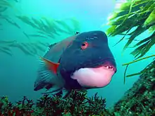 The California sheep head (Semicossyphus pulcher) is a species of wrasse native to the eastern Pacific Ocean. Its range is from Monterey Bay, California, to the Gulf of California, Mexico.[5] It can live for up to 20 years in favorable conditions and can reach a size of up to 91 cm (3 ft) and a weight of 16 kg (35 lb).[5] It is carnivorous, living in rocky reef and kelp bed habitats, feeding primarily on sea urchins, molluscs, and crustaceans.