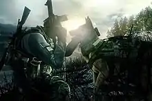On April 29, 2013, the official Call of Duty website was updated with a social media mosaic that filled up every time a user logged into the site via Twitter or Facebook. The next day, the mosaic was completed and the picture showed a skull along the text "the Ghosts are real."[23][24] Some details about Ghosts leaked prior, especially when Tesco pulled the listing of the game for the PlayStation 3 after it was put up accidentally.[25] Several other retailers, including Target, listed it for PlayStation 3 and Xbox 360.[5][26][27] The live-action teaser trailer for Ghosts, titled "Masked Warriors", features glimpses of people wearing historical battle masks, among them one of a group of soldiers putting on the skull mask shown on the box art. It was released on May 1, 2013. Ghosts appeared at the "Xbox Reveal" event on May 21, 2013.[28]