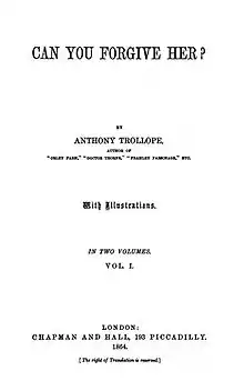 Can You Forgive Her? is a novel by Anthony Trollope, first published in serial form in 1864 and 1865. It is the first of six novels in the Palliser series, also known as the Parliamentary Novels.