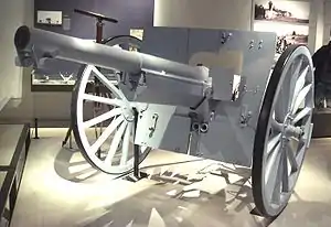 During 1914 a number guns mounted on the carriage of the Canon de 155 long modèle 1877 and the new guns were given the designation Canon de 100 mm TR mle 1897.[33] The gun was fairly conventional for its time and most nations had similar guns such as the German 15 cm Ring Kanone L/30 which was also a converted naval gun. Like many of its contemporaries, it had a tall and narrow box trail carriage built from bolted iron plates with two wooden spoked wheels. The carriages were tall because the guns were designed to sit behind a parapet with the barrel overhanging the front. Like its contemporaries, its carriage did not have a recoil mechanism or a gun shield. However, the guns could be connected to an external recoil mechanism which connected to a steel eye on a firing platform and a hook on the carriage between the wheels. A set of wooden ramps were also placed behind the wheels and when the gun fired the wheels rolled up the ramp and was returned to position by gravity. There was also no traverse so the gun had to be levered into position to aim. A drawback of this system was the gun had to be re-aimed each time which lowered the rate of fire. The wheels could be fitted with detachable grousers designed by the Italian major Crispino Bonagente for traction on soft ground and these consisted of rectangular plates connected with elastic links and are visible in many photographs of World War I artillery from all of the combatants. For transport, the gun was broken down into two loads for towing by horse teams or artillery tractors.
