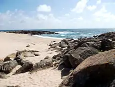 The cape has a small sheltered beach between its boulders known as Dois Cabos Beach, literally two headlands beach.