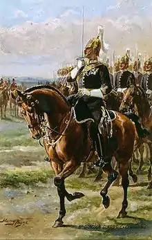 The original uniform of the Queen Dowager's Regiment of Horse is recorded as including a red coat lined with green. In common with other regiments of Horse, cuirasses were worn until 1699. In 1715 the regimental facing colour was changed to pale yellow. In 1768 white lapels were adopted by Royal Warrant. Silver epaulettes were worn by the officers. In 1812 a new model of leather helmet was issued, carrying the title of "6th Dragoon Guards or Carabiniers". In 1861 a complete change of uniform was authorized by Queen Victoria, following the conversion of the regiment to a light cavalry role and appearance.[10] Thereafter until 1914 the full dress of the regiment was entirely dark blue with white facings. Although the designation of Dragoon Guards was retained, the 6th was the only dragoon regiment in the British Army to wear dark blue tunics instead of scarlet. After 1873, a white plume was worn on the brass[11] helmet.[12]