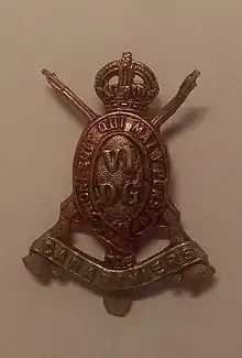 The distinctive feature of the collar and cap badges as worn from 1900 and 1902 respectively, was the appearance of crossed carbines under a crown and above the regimental title.