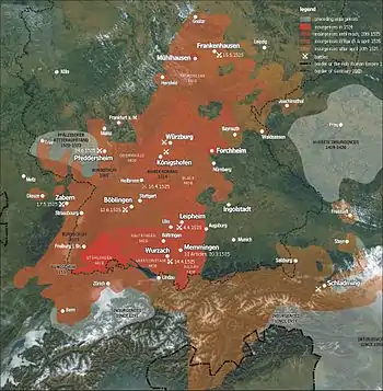 The unorganized peasant armies were defeated in the Würzburg area by a coalition of the Swabian League and other allies of the bishop of Würzburg. Their resistance and morale collapsed due to their massive losses. Casimir, whose actions had earned him the nickname "Bloodhound", gained the upper hand. Rebel villages, most of whom surrendered without resistance, where pillaged and looted. Casimir also devastated villages in his own territory: he had entire villages burned down, and rebels were executed. Reportedly, he had 300 people killed in Feuchtwangen alone. In Kitzingen, he wanted to set an example: he promised the bailiff Louis von Hutten that the lives of the residents would be spared. After they surrendered, however, he punished them hard by chopping off their right hand index and middle fingers (the "oath fingers") and blinded them and sent them into exile. His "captain" Augistin stabbed the eyes of 58 people who had said they "wanted to see no more Margrave" before the rebellion. This act was even at the time seen as monstrous atrocities.[2] He also punished Rothenburg and wrung territorial concessions from the city. Contemporary reports claim that the market squares of Rothenburg and Schweinfurt were dyed red by the blood of the beheaded rebels. Since Casimir was described as the imperial henchman, it can be assumed that he acted in accordance with the wishes of the Emperor or the Swabian League. He sent his brother John Albert to Bayreuth to punish the city for its lack of support when he was raising troops. He only ceased his punishments when it emerged in November 1526 that innocent people were affected as well.
