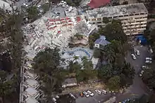 Much of Port-au-Prince's infrastructure was significantly damaged or destroyed in the earthquake, including the Presidential Palace, the National Assembly building, the Port-au-Prince Cathedral, hospitals, schools and the main prison.[14][15][16] All hospitals were destroyed or so badly damaged that they were abandoned.[17] In addition, the facilities of foreign governments and non-government organizations were badly damaged in the quake, including the headquarters of the United Nations Stabilisation Mission in Haiti (MINUSTAH), which was destroyed.[18]