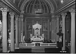 In the 1970s, Bishop John L. May made modifications to the sanctuary in compliance with the 1970 General Instruction of the Roman Missal. The altar was moved forward and the altar rails were removed. The cathedra was moved to its present location on the south end of the sanctuary facing the congregation. At this time, Bishop May also added a bronze representation of the Risen Christ above the baldachin and a large crucifix over the tabernacle.