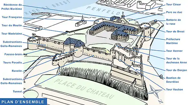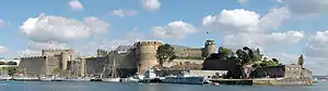 The Château de Brest is a castle in Brest, Finistère, France. The oldest monument in the town, it is located at the mouth of the river Penfeld at the heart of the roadstead of Brest, one of the largest roadsteads in the world. From the Roman castellum to Vauban's citadel, the site has over 1700 years of history, holding right up to the present day its original role as a military fortress and a strategic location of the highest importance. It is thus the oldest castle in the world still in use, and was classified as a monument historique on 21 March 1923.[1]