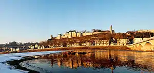 The Hundred Years' War in the 14th and 15th centuries was fought between the kings of England and France over the succession to the French throne. The war ended in 1453 when the English were finally ejected from France, but in the early 15th century the English under King Henry V made significant territorial gains.[31] The Treaty of Troyes in 1420 made Henry V the heir apparent to the French throne but when the French king, Charles VI, and Henry V died in the space of two months in 1422 the issue of succession was again uncertain. The English supported Henry V's son, Henry VI who was still a child, while the French supported recognised Charles VII, the Dauphin of France.[32] Between 1427 and 1450 Château de Chinon was the residence of Charles,[33] when Touraine was virtually the only territory left to him in France, the rest being occupied by the Burgundians or the English.