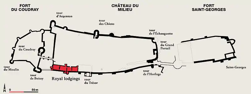 The easternmost enclosure is known as Fort St-Georges, the central is the Château du Milieu (the middle castle), while the westernmost is known as the Fort du Coudray. The Fort St-George was built under Henry II and contained a chapel dedicated to St George, England's patron saint. The Château du Coudray was added by Philip II in the early 13th century, while the Château de Milieu was built in the 12th and 14th centuries.[44] The round Tour du Coudray built by Philip II (which has parallels at Dourdan, Falaise, Gisors, Laon, and Lillebonne)[25] guarded the bridge linking the Fort du Coudray and the Château de Milieu.[45] While the curtain wall stands in many places, the buildings within the château do not survive to the same extent, and in many cases little more can be said about them than the location of their foundations and possible use.[40]