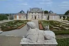 The gardens of the château were created between 1717 and 1724 by Alexandre Eutrope de Lur Saluces. They were inspired by the gardens that he saw in Florence during his grand tour of Italy and his time spent at the court in Versailles. The park has a wide central axis and two terraces, with groups of statues and vases. The statues were done by Italian artists brought there for that purpose in the early part of the 18th century, and represent figures from Greek mythology: Cephalus, Aurora, Cupid, Aphrodite (Venus), Adonis, and Flora, the goddess of flowers and gardens. Other statues represent wine-making, the joys of the hunt and fishing, wine and intoxication. To the east of the first terrace is a small theater, decorated with figures from the Italian commedia dell'arte: Pantalone, Scaramouche and Harlequin. A stairway leads to a second terrace, where there are statues symbolizing of earth, wind, air and fire.[2]
