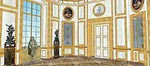 The Château-Neuf had five levels, but due to the steep slope, did not have the same appearance on the side of the parterre as on the side of the forest. It was composed of three pavilions crowned with roofs with ridge terrace, connected by building wings. This sober architecture, which was not to overshadow the architectural character of the neighboring Château-Vieux, was nevertheless enriched by fine sculptures on the side pavilions, and the central pediments, where angels holding the coat of arms of the Dauphin. Inside, a succession of apartments opened onto a large central corridor. The interior decoration, which highlighted the collections of the Dauphin, was composed of woodwork panels varnished or painted in patel colors, enhanced by gilding. A ceremonial apartment was planned for Monseigneur, since Louis XIV retained his usual accommodation in the Château-Vieux, despite the new construction. The Château-Neuf was the admiration of all Europe. It was imitated some ten years later by the Duke of Antin at the Petit-Bourg castle in Evry.[11]