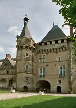 There are no accurate records currently available as to the extent of the building at this time, but a later drawing shows 2 wings, on either side of the tower. The east wing also extended north to meet the church. This section was known to have been further extended in 1638 by Isabelle Salviati whilst the church was being worked on.[21] The West wing was destroyed in a fire in 1723[22].The joining edge can be seen on the northwest corner of the tower. The 2 wings and tower enclosed the great courtyard of the Chateau that contains the well.[23] This is covered with a distinctive roof held on stone columns built in 1814 that has become emblematic of the Chateau.