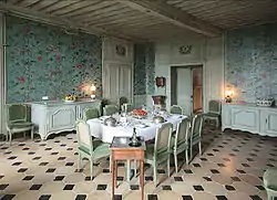 The 1st floor windows were enlarged and the corridors and interiors modified in the 1780s by the Burgeat family.[25] Later residents, the Stapfer also built, in a ground floor room a place of worship (they were a strongly Protestant family) and there is still a wooden plaque over the fireplace inscribed "Cult Evangelical Protestant".[26]