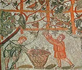 Roman colonies of veteran soldiers were established in the new provinces to maintain order. Caesarea itself was made a colony, with its residents gaining Roman citizenship. It prospered as a provincial capital during the 1st and 2nd centuries, reaching a population of over 20,000[15] and possibly as many as 30,000.[17] It was defended by auxiliary units and was the harbor of Rome's Mauretanian Fleet,[13] which was established as a permanent force after Berber raids in the early 170s. The city featured a hippodrome, amphitheater, numerous temples, and civic buildings like a basilica.[18] It was surrounded by suburban villas whose agricultural mosaics are now celebrated.[15] It had its own school of philosophy, academy, and library. It received a new forum and further patronage from the African emperor Septimius Severus and his dynasty, possibly reaching as many as 100,000 inhabitants.[19] Its native son Macrinus and his son Diadumenian became the first Berber and lower-class emperors, reigning in 217 and 218. (Their predecessor's wastefulness and wars required unpopular financial adjustments that led to their overthrow in favor of Elagabalus.) Juba's theater was converted into an amphitheater sometime after the year 300.[13]