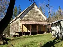 A town landmark was the Grizzly Hotel, built by the Turney family in 1852. The Grizzly Hotel was described by a local newspaper in 1854 as “one of the pleasantest homes for miners or travellers in the country. Mr. Welch, the present proprietor, is just one of the most accommodating landlords to be scared up, besides having fitted up his house in a style of superiority not often to be met with so far up in the mountains”.[26] The hotel had a public hall which was frequently the site of dances and entertainments, such as Fourth of July celebrations.[27] 1867, Mrs. Turney, now estranged from her husband, took over the hotel and renamed it the Cherokee Hotel. In 1871, a fire destroyed the Cherokee Hotel and saloon.[28]