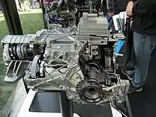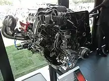 The Stingray uses a new version of the LS based GM small-block engine derived from the C7 Stingray's LT1, now called the LT2.[12] The new naturally aspirated 6.2 L V8 is rated at 490 hp (365 kW; 497 PS) at 6,450 rpm and 465 lb⋅ft (630 N⋅m) of torque at 5,150 rpm, an improvement of 40 hp (30 kW; 41 PS) and 10 lb⋅ft (14 N⋅m) over the outgoing C7 Corvette Stingray.[13] The engine uses dry sump lubrication system.[14] Like the C7, the C8 features Active Fuel Management, or cylinder deactivation, which is used when the car is subjected to low load scenarios such as highway cruising.[15][16]