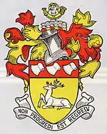 The coat of arms were granted in 1951 and represent Or, a stag at rest proper, on a chief gules three axe-heads bendwise sinister with blades down-words argent.[2]