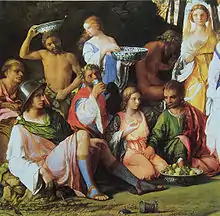 In Italy, the first known depiction of Chinese porcelain bowls is from The Feast of the Gods by Giovanni Bellini (1514).[1] The style of the bowls is that of the Ming dynasty blue and white porcelain type, maybe examples of which are known to have been exported in Persia, Syria and Egypt.[1] The painting by Bellini was a request by Duke Alfonso I d'Este, who was known for his interest in Chinese porcelain. It seems that Bellini found samples of the Chinese ware not through trade, but among diplomatic gifts received by Venice from the Mamluke Sultans in 1498 (gift to Doge Barbarigo), and in 1498 and 1508 (gift to the Signoria).[1]
