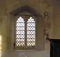 Remains of wall paintings were discovered on the North wall in 1963; these are believed to be 14th and 15th-century in date (some may be as early as the 13th-century). There is evidence that this wall was decorated along its whole length. Directly opposite the entrance is the best preserved of the murals which shows the lower half of St Christopher including his feet, the bottom of his staff, some cliffs and fish darting in a stream. On the right (East) side the banks of the stream can be seen, and on the left is the faint image of the hermit standing in his cell with his lantern to guide the Saint. This painting is late 15th-century in date and the muted colours include red, yellow, grey and black, with a hint of vermilion. Other features include what appears to be a mermaid and part of a pillar, and these may belong to an earlier 14th-century mural. The upper half of the Saint carrying the infant Christ was accidentally destroyed during the reconstruction of the nave roof in 1881. To its right is a fragment showing a wheel design with figures of mysterious creatures, while to the East of the eastern nave window a hooded human figure can be seen on the window edge close to the pulpit. This latter section may have been part of a Doom Painting, portraying the Last Judgement. A consecration cross of unusual design is visible on the South East face of the stair turret.[1][4]