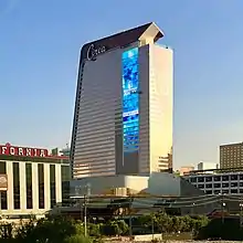 The Circa hotel tower was topped out on June 19, 2020.[24] During construction, a minor error occurred on the west side of the tower's 30th-floor exterior. Mo Pierce, one of the project engineers, installed a white-colored glass panel in the wrong spot, making it stand out from the rest of the paneling.[19][25][26] By mid-2020, the mistake had gained an online following, and Derek Stevens said the misplaced panel was nicknamed as the "MoDot" and was used as a reference point: "(We'd say) plumbing is going on three floors below the MoDot, we're doing this above the MoDot. It became a noun, it became part of our regular vocabulary."[25] The MoDot was eventually removed, a few days after the resort's opening.[27] Circa was the first new hotel-casino to be built in downtown's Fremont Street area since the D Las Vegas, which originally opened as the Sundance in 1980.[2][28][29]