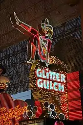 The resort's design includes references to past and modern Las Vegas history.[42][54] Various forms of artwork, including murals, are featured throughout Circa.[55] The resort's lobby incorporates the former Vegas Vickie cowgirl sign that once advertised Glitter Gulch.[56][18][15]
