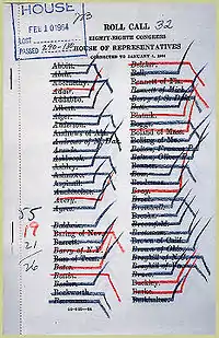 The legislation had been proposed by President John F. Kennedy in June 1963, but it was opposed by filibuster in the Senate. After Kennedy was assassinated on November 22, 1963, President Lyndon B. Johnson pushed the bill forward. The United States House of Representatives passed the bill on February 10, 1964, and after a 54-day filibuster, it passed the United States Senate on June 19, 1964. The final vote was 290–130 in the House of Representatives and 73–27 in the Senate.[6] After the House agreed to a subsequent Senate amendment, the Civil Rights Act was signed into law by President Johnson at the White House on July 2, 1964.