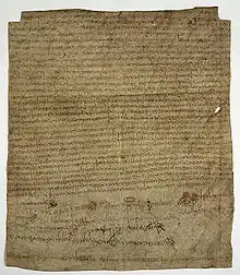 From the terms, derived from Roman law, which Clotilde uses to describe the lands she is granting to the nunnery, it appears that these had belonged to her son who had died without heirs. The term Deo devota used to describe her is read as meaning that Clotilde herself will become a nun in her new foundation. The vir inluster Charicard who is to have a life interest in Fontenay-lès-Briis is presumed to be Clotilde's husband for the legal terms used suggest that she was not a widow.