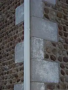 The walls of the two-story structure are made with rounded field stones between limestone quoins that both decorate and stabilize the walls.[1] The multi-colored field cobbles are held in place with limestone mortared "V" joints, typical of cobblestone construction of the Middle Period.[4] The quoins are twelve inches (305 mm) high, and there are three to four courses of cobblestones for each quoin. The house is laid out with two windows on either side of a central entrance. The one-story porch outside the front door has Victorian details under a hip roof. The Greek Revival features of the entrance include square pilasters and half side-lights. The builder and/or architect is not known.[1]