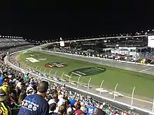 Because of a conflict with Macy's fireworks shows that NBC has broadcast rights, the race was moved to Sunday, The race was aired on NBC Sports after 8 years on TNT, The start of the race was delayed to 11:42 p.m. ET following a rain delay of over three and a half hours, making it the latest the race has started in the history of the race. Due to rain washing out qualifying, Dale Earnhardt, Jr. started on the pole based on practice 1 speeds.[36] Earnhardt, Jr. dominated the race, leading 96 laps en route to his second victory of the year. However, the win itself was overshadowed by a violent last-lap crash at the checkered flag involving 25 cars, which saw Austin Dillon flip over and fly into the tri-oval catch fence in a way eerily similar to the last-lap wreck by Kyle Larson in the February 2013 Xfinity race that injured thirty-three, and a wreck by Geoff Bodine in the same spot in the inaugural Truck Series race there in 2000. The resulting impact ripped out Dillon's engine, broke a catch fence support, and thirteen fans were injured by flying debris.[37] Eight of the fans declined treatment, the other five were treated and released with four at the infield care center, and one at a local hospital. There were 22 lead changes amongst 12 drivers, and the race ended at 2:38 a.m. Monday morning.