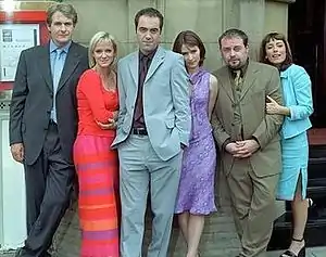Mike Bullen has sole writing credit on 26 episodes of the series; four episodes of Series 3 were written by David Nicholls, and Bullen co-wrote one episode of Series 4 and 5 with Mark Chappell and Matt Greenhalgh respectively.[45][46] Bullen usually wrote ten pages of script per day, whatever the quality of his writing. His own third draft was usually submitted to the producers as the "first" draft.[9] As he was still an inexperienced writer by the time production of the first series began in January 1998, Bullen was aided by Christine Langan, who pitched in as a script editor.[47] Storylines were planned in advance—the producers knew that they wanted to split up Adam and Rachel at the end of Series 1—but the later scripts were written once filming on earlier episodes had already begun.[48] The number of people on the development team varied; the third series' comprised Bullen, Langan, Harries, producer Spencer Campbell, script editor Camilla Campbell, ITV's controller of comedy, and a team of five writers.[45]