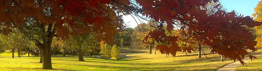 During Wichita’s real estate boom days of the 1880s, when the city was known as the "Peerless Princess of the Plains",[7] mule-drawn streetcars traveled up and down Douglas Avenue taking residents to and from work and shopping. A college was planned for the area where the park now is, and plans changed. The area that is now College Hill Park served as the Wichita Country Club from 1901–1912. It was redeveloped from an overgrown golf course into its current park configuration, including its swimming pool, via WPA funds during the Great Depression.[8]