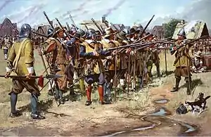 The first provincial forces in British North America were organized in the 1670s, when several colonial governments raised ranger companies for one year's paid service to protect their borders (see above).[16] The major operations during King William's War were conducted by provincial troops from Massachusetts Bay. During Queen Anne's War provincial troops from Massachusetts Bay, Connecticut, and New Hampshire made up the bulk of the English forces. [17] During King George's War the land forces that took Louisbourg were entirely supplied by Massachusetts, Connecticut, New Hampshire, and Rhode Island.[18] During the French and Indian War the British government in London took an increasingly more leading part, relegating the provincial troops to a non-combat role, largely as pioneers and transportation troops, while the bulk of the fighting was done by the regular British Army. However the contributions of Connecticut, Massachusetts Bay, New Hampshire, and Rhode Island were essential.[19]