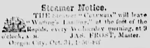 Columbia began its first trip up the Columbia on the morning of July 3, 1850, with James Frost acting as captain.[3] No one on board knew where the channel was, and the steamer's progress was slow. To act as pilots, Frost hired two young people of the Coast Salish who had been fishing on the river. By the end of the first day, they had travelled fifty miles, and Frost, not wanting to risk the vessel in the dark, tied up to the riverbank.[3] The next morning, July 4, 1850, the steamer cast off again and proceeded upstream, arriving at Portland, Oregon (then only a small settlement) at 3:00 p.m.[4] After staying at Portland for abouttwo hours, Columbia then proceeded on to Oregon City, arriving there at 8:00 p.m., where there was a celebration of the vessel's arrival.[2][4] It had taken 26 hours to make the trip.[7]