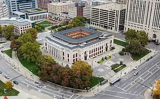 The five-story building, constructed of Indiana limestone, was designed by the Allied Architects Association of Columbus in the Neoclassical style and built at a cost of US$1.7 million,[5] equivalent to $25.31 million in 2019.[8] Allied Architects also designed the adjacent Central Police Station building at West Gay Street and Marconi Boulevard, which opened on March 26, 1930, was vacated in 1991 with the opening of a new police headquarters building, and was renovated in 2012 to allow the consolidation of various city government offices.[9][10] City Hall was originally also the venue for the city's Municipal Court, and its proximity to the Police Station building provided for efficient movement of prisoners between the two buildings.