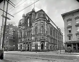 Columbus's first city hall was at the Central Market building, but it moved to a new building on Capitol Square in 1872. In 1921, a fire destroyed that building,[1][2] now the site of the Ohio Theatre.[3] James John Thomas, mayor of Columbus from 1920 to 1931, laid the cornerstone for a new City Hall on October 29, 1926.[4] The building was dedicated on April 18, 1928.