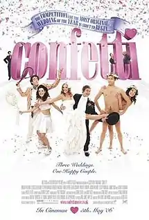 Confetti is a 2006 British mockumentary romantic comedy film released on 5 May 2006. It was conceived and directed by Debbie Isitt and stars many acclaimed British comedians, including Jessica Stevenson, Jimmy Carr, Martin Freeman, Mark Heap, Julia Davis, Robert Webb and Olivia Colman. It follows a bridal magazine competition for the most original wedding, the ultimate prize being a house, and the three couples who are chosen to compete. The film follows the contestants in a fly-on-the-wall documentary style, akin to The Office. The script is entirely improvised.