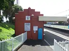 The new station included three single-storey buildings: a ticket office at street level on Gladstone Avenue, and two identical platform buildings containing a waiting room and toilets. The buildings were constructed in the functionalist style from dichromatic brick using iron oxide and clinker bricks with soldier courses. The platform buildings feature distinctive Art Deco style vertical 'fins' extending above the awnings at both ends. While all three buildings remain today, the exteriors have been painted over and the original internal fit-outs removed. The station is deemed to have local heritage significance.[6]